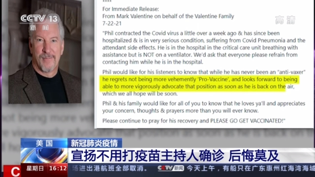 菲尔·瓦伦丁是美国一名广播节目主持人,作为保守派的一员,他曾多次在节目中告诉听众,如果不是直接面临新冠肺炎的危险,不用接种疫苗。直到他自己也感染了新冠肺炎,菲尔的家人发表声明说,他一周多前感染了新冠肺炎,然后住院治疗,情况危急。于是菲尔后悔了。