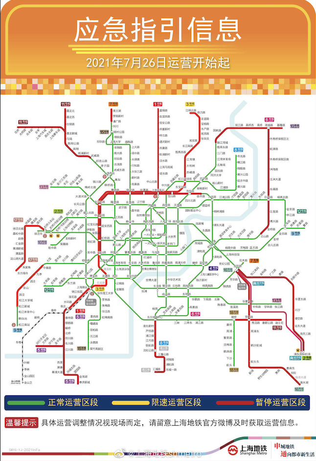 受强台风“烟花”影响,为保障市民乘客和运营安全,上海地铁根据气象部门和现场监测数据等综合研判,“烟花”台风风力对轨道交通造成行车影响。7月26日运营开始起,上海地铁3、5、16、17号线、浦江线、磁浮线全线,以及其他线路地面、高架区段车站暂停运营。(总台央视记者 魏然)
