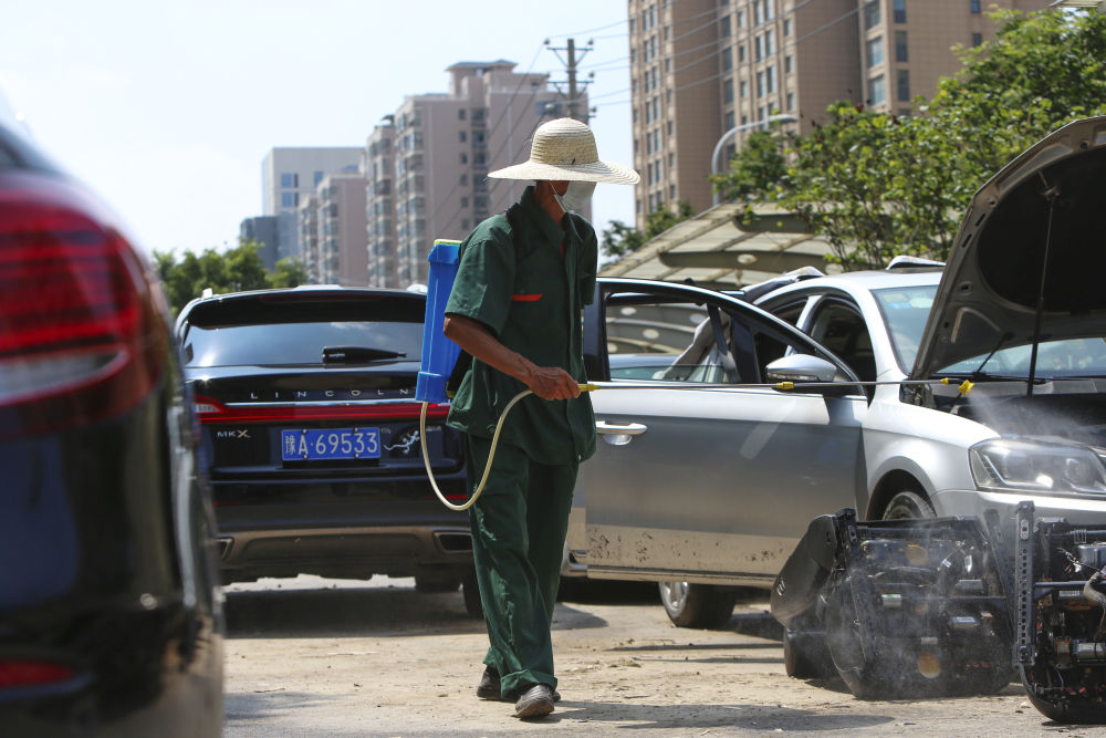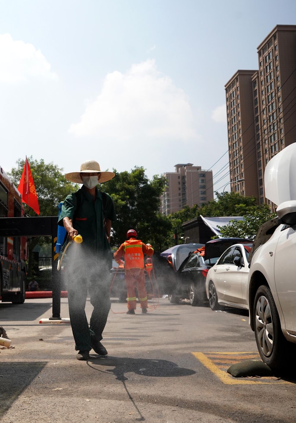 ↑ 7月25日,工作人员在郑州市中牟县的一个小区内进行消杀作业。新华社记者 李安 摄