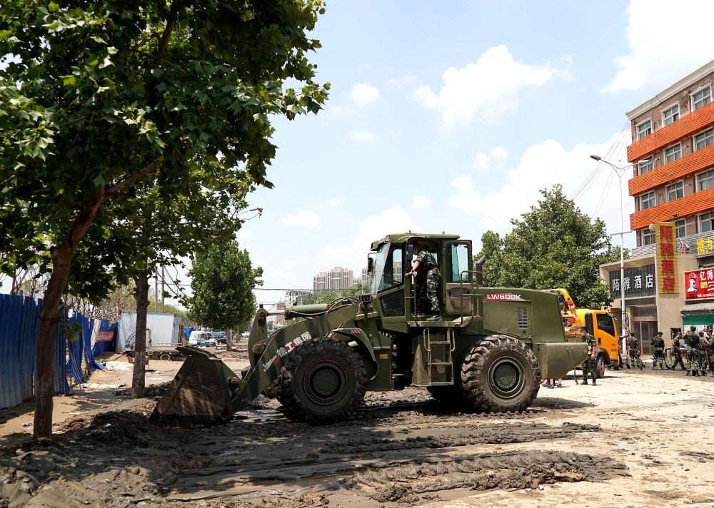 ↑ 7月25日,救援人员驾驶铲车在郑州市中牟县进行路面清淤作业。新华社记者 李安 摄