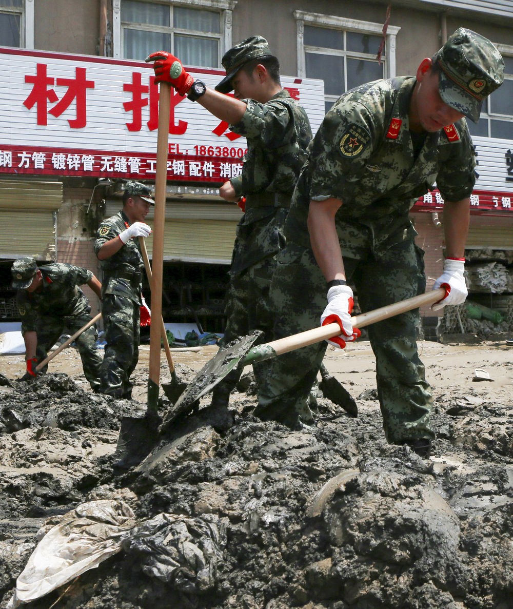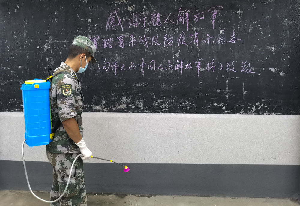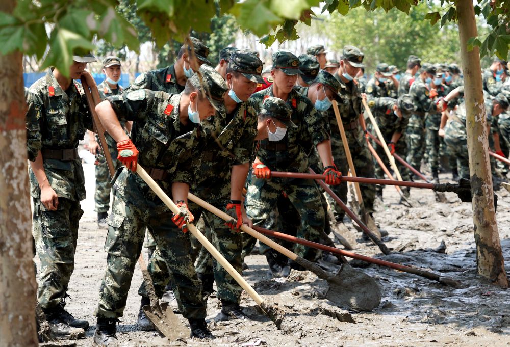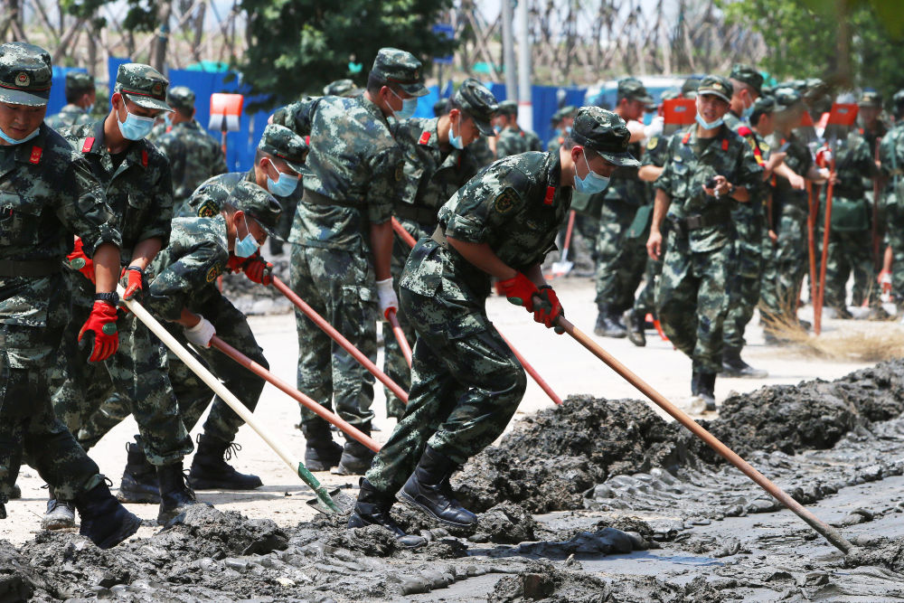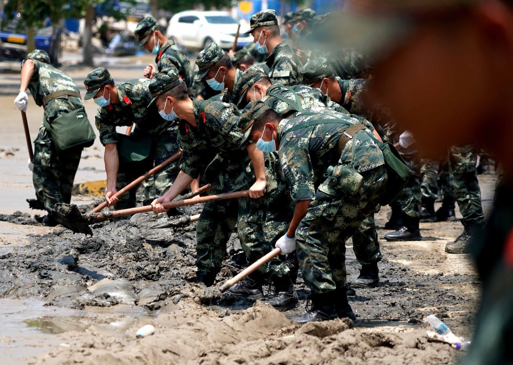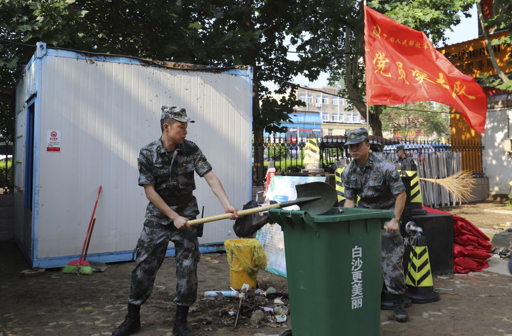 ↑ 7月25日,郑州联勤保障中心某汽车团官兵在郑州市中牟县白沙镇开展卫生清理工作。新华社发(蒋卓峰 摄)