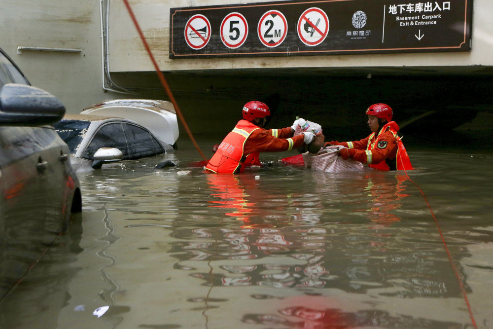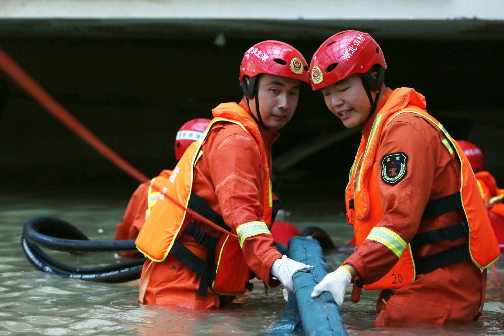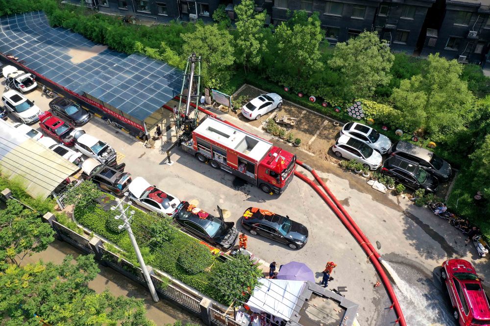 ↑ 7月25日,湖北消防总队黄冈支队的救援人员在郑州市中牟县某小区的地库内进行排涝作业。新华社记者 李安 摄