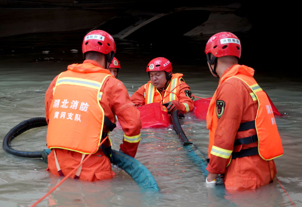 ↑ 7月25日,湖北消防总队黄冈支队的救援人员在郑州市中牟县某小区的地库内进行排涝作业。新华社记者 许雅楠 摄