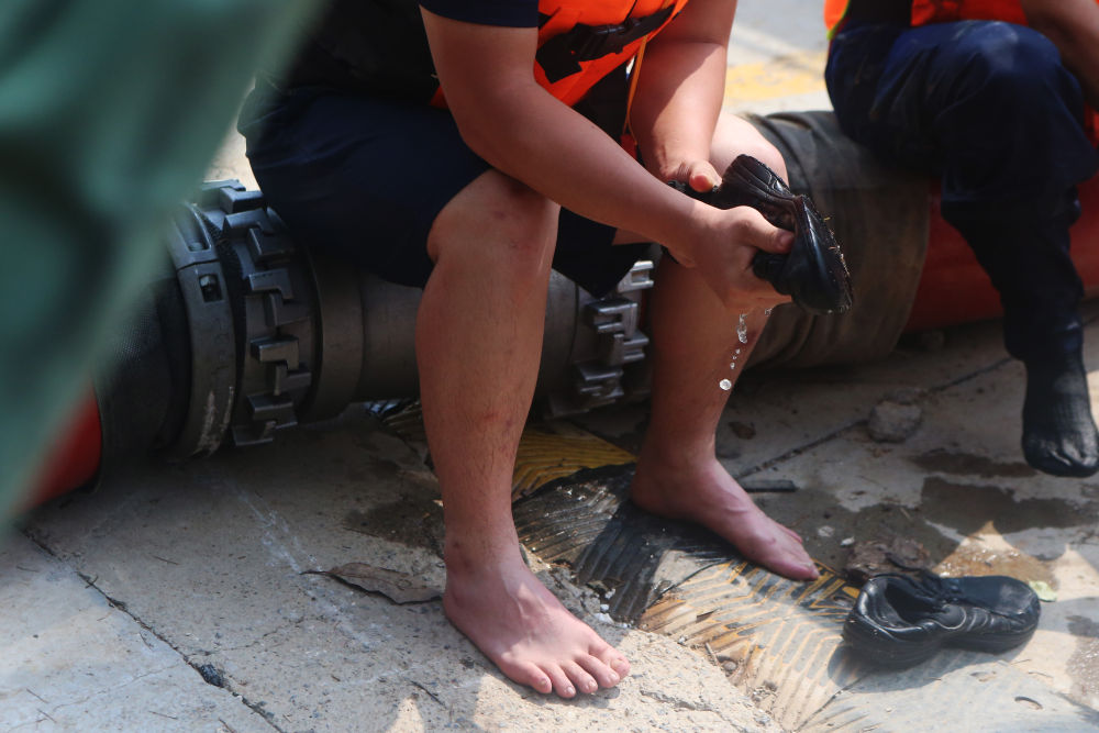 ↑ 7月25日,救援人员在郑州市中牟县一处地库进行排涝作业后,拧干鞋内的水。新华社记者 许雅楠 摄