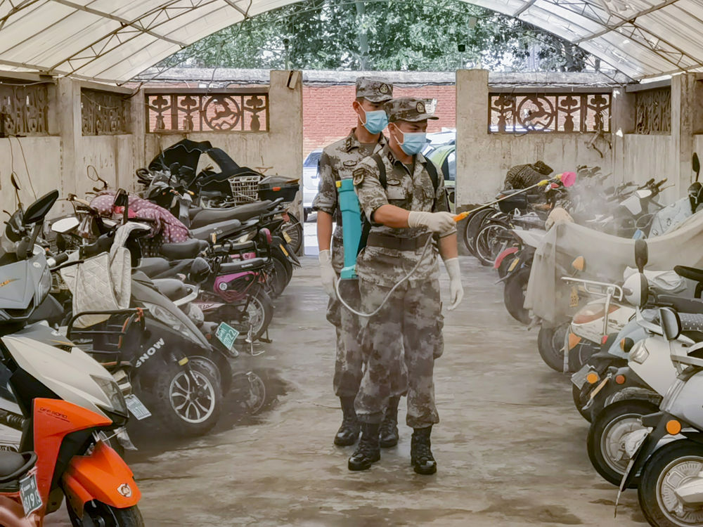 ↑7月25日,郑州联勤保障中心某汽车团战士在郑州市农业路开展防疫消杀工作。新华社发(王维 摄)