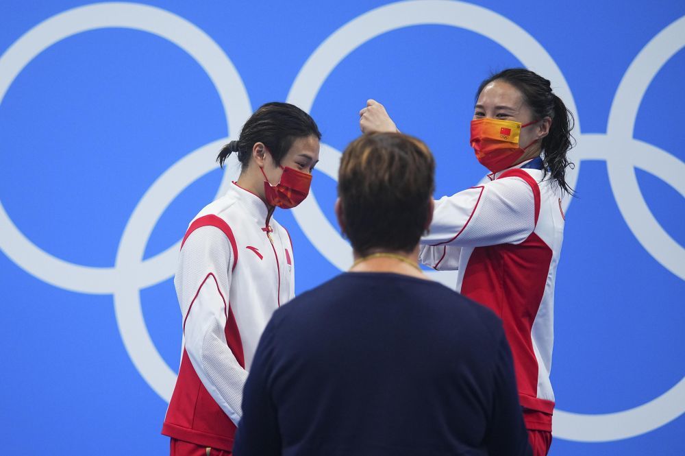 7月25日,中国选手王涵(右)在颁奖仪式上为队友施廷懋戴金牌。新华社记者 许畅 摄