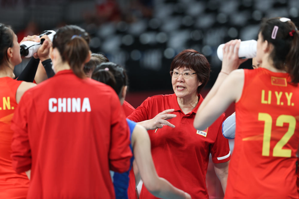 7月25日,中国队主教练郎平(右二)在场边与队员交流。新华社记者 丁汀 摄