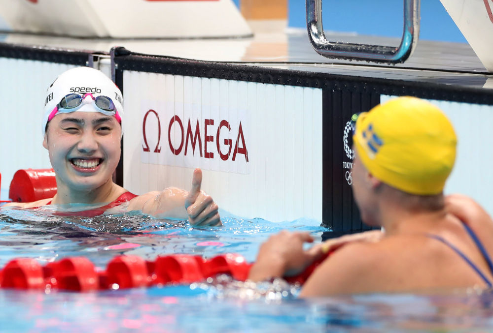 7月25日,张雨霏(左)在比赛后。新华社记者 丁旭 摄