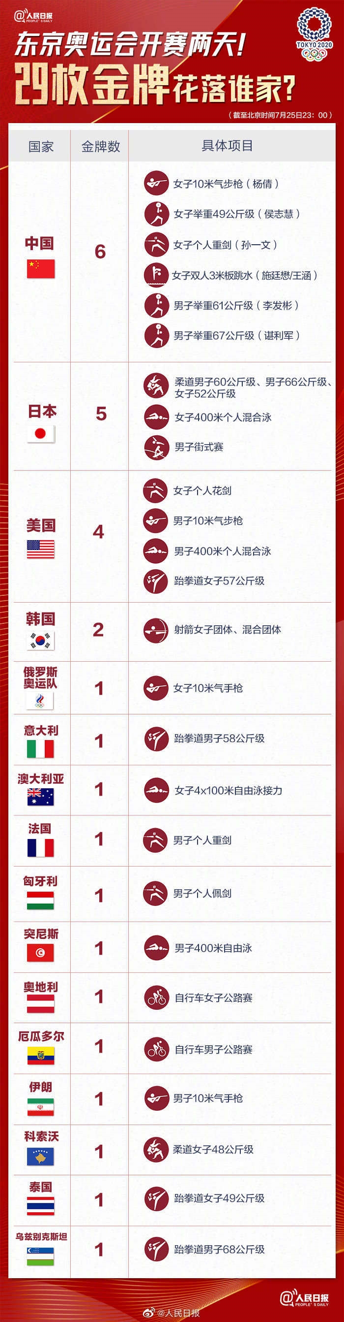东京奥运开赛两天,已产生29枚金牌,其中中国代表团斩获6枚。其他金牌都花落谁家?一张图带你看↓↓