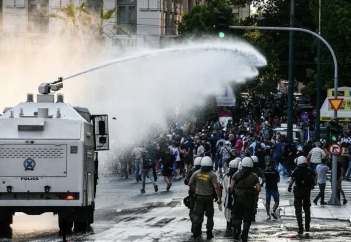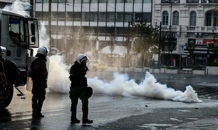 希腊警方随后发表声明称,在游行结束后,大约1500人仍聚集在宪法广场及周边地区不肯离开,警方一再要求示威人员散去以恢复附近交通,但遭到拒绝。其后,示威人员开始向防暴警察投掷石块、燃烧瓶等。警方因此不得不使用催泪瓦斯和水炮以化解示威者的攻击。