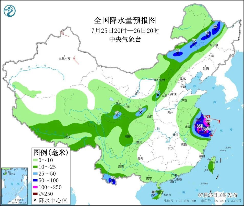 7月25日20时至26日20时,浙江中北部、上海、江苏中南部、安徽东南部、内蒙古中东部、吉林西部、黑龙江西部、海南岛西部、云南南部、台湾岛南部以及青海东部、甘肃东南部等地的部分地区有大雨或暴雨,其中,浙江北部、上海、江苏东南部、安徽东南部等地的部分地区有大暴雨,浙江北部、上海等地的局地有特大暴雨。