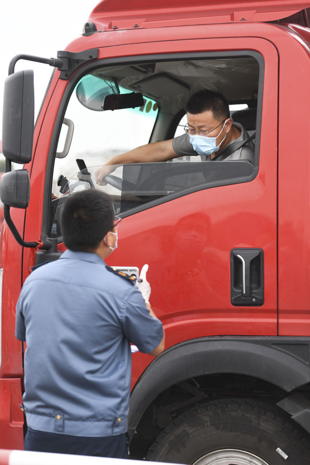 ↑7月25日,在宁洛高速公路曹庄收费站,执法人员在查验离城车辆驾乘人员核酸证明及健康码。