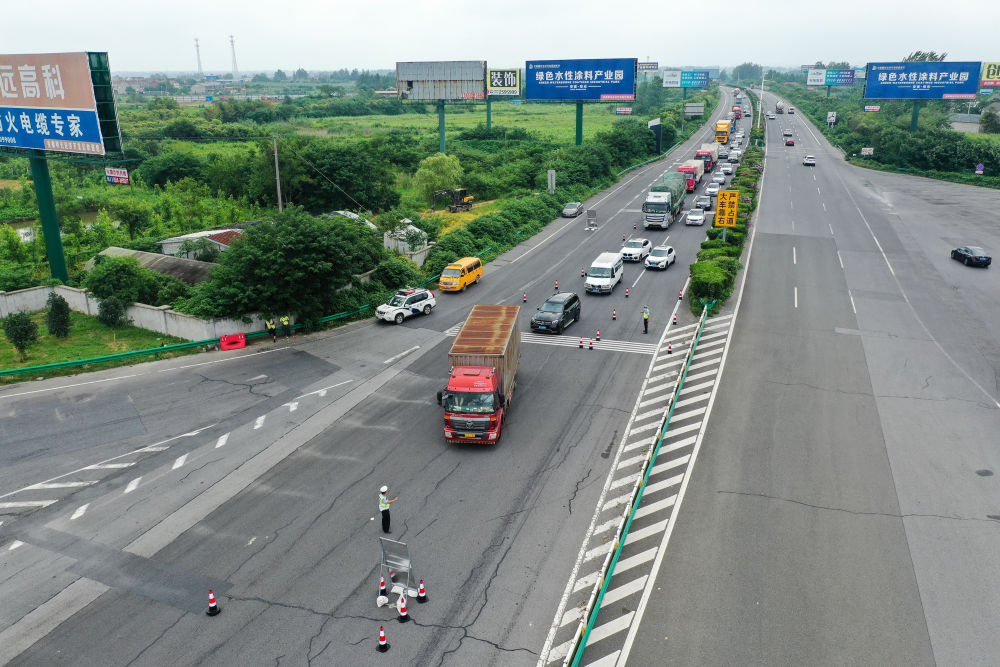 ↑7月25日,在宁洛高速公路曹庄收费站,执法人员在分流车辆(无人机照片)。