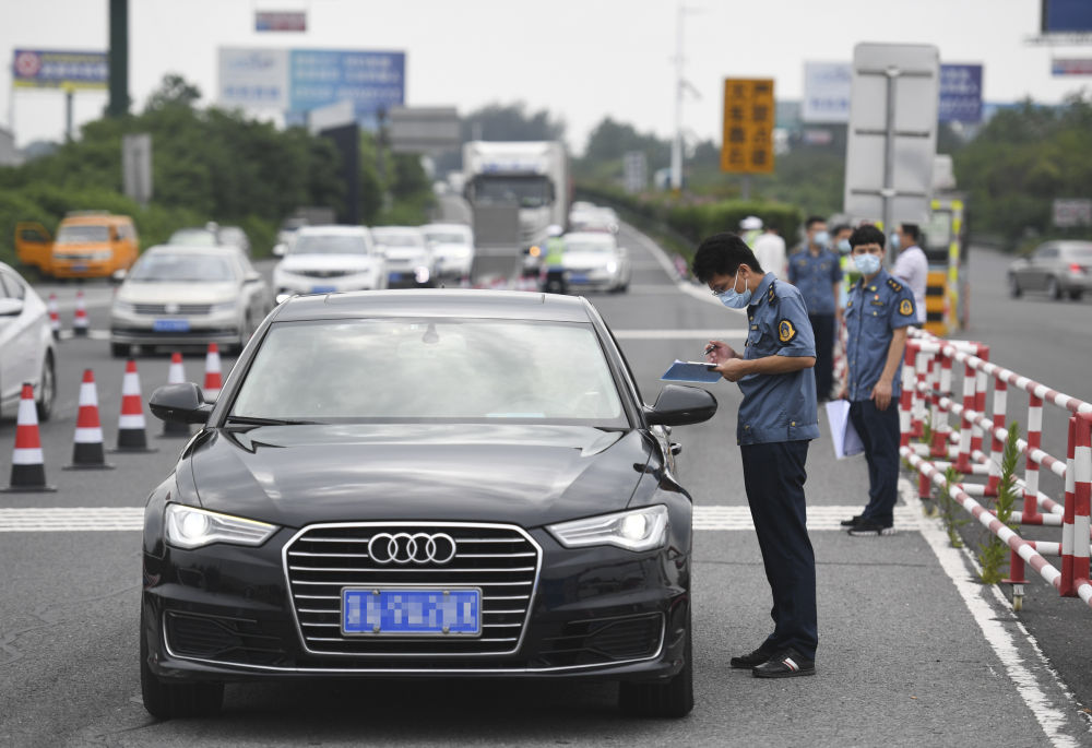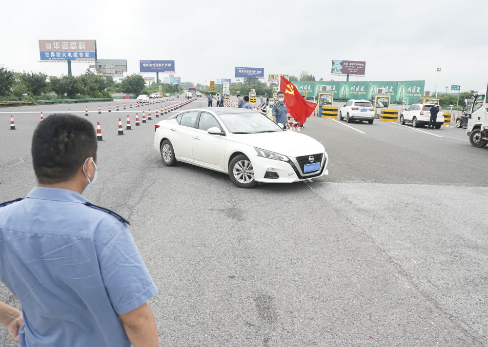 ↑7月25日,在宁洛高速公路曹庄收费站,一辆汽车被劝返。