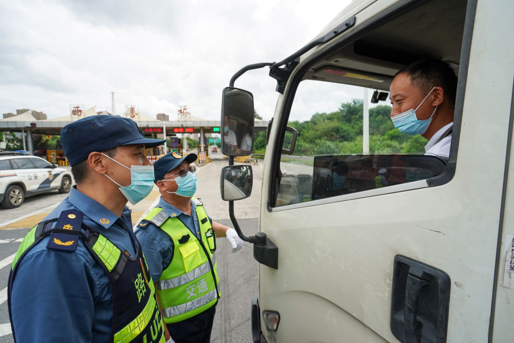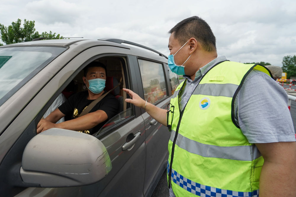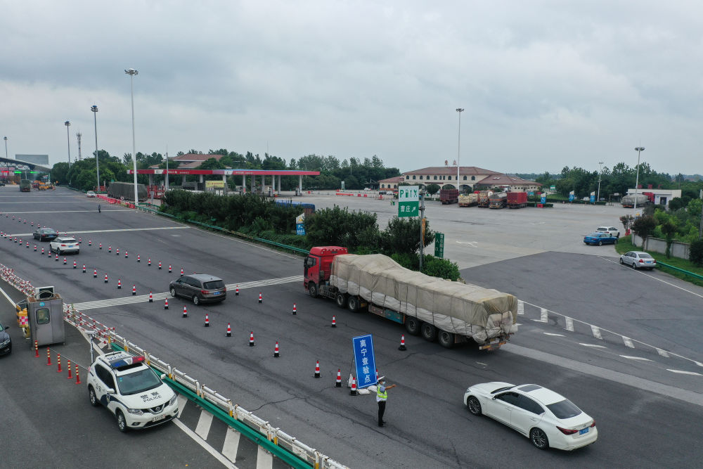 ↑7月25日,在南京绕城高速公路西善桥收费站,执法人员向过路司机介绍疫情防控通告。