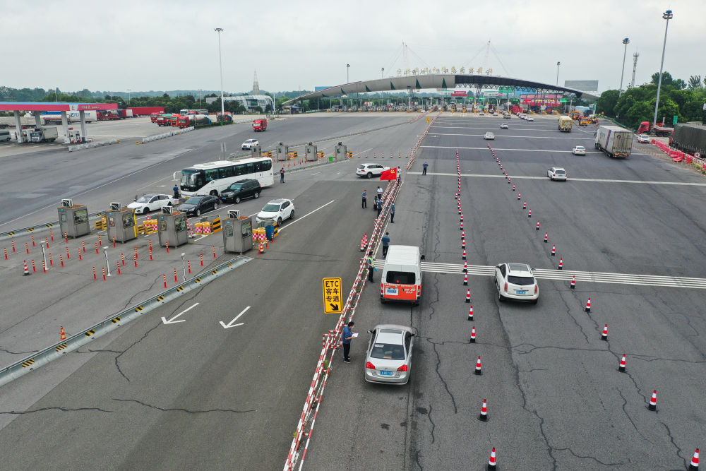 ↑7月25日,在宁洛高速公路曹庄收费站,执法人员在查验离城车辆驾乘人员核酸证明及健康码(无人机照片)。