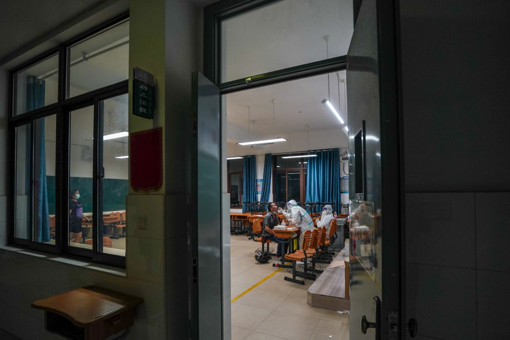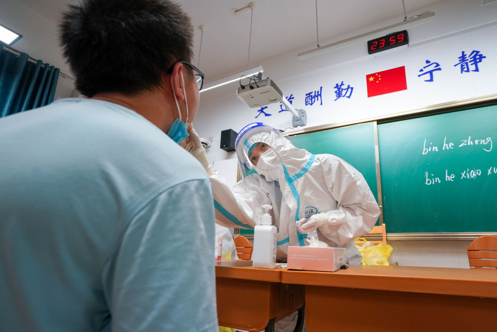 “请张开嘴,抬起头,啊……”在南京市江宁区龙西社区核酸检测点,来自江宁区东山社区医院的护士汪雨在为社区居民进行核酸检测取样。不到一分钟的时间里,汪雨熟练地完成了取样工作,此时已是深夜时分。