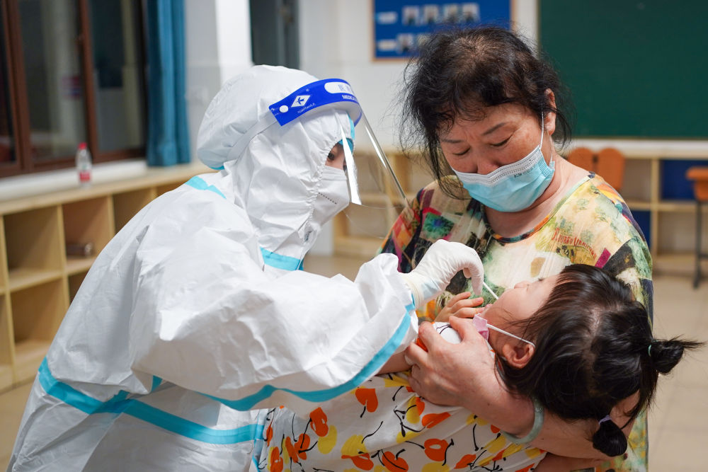 ↑7月24日晚,汪雨(左)在南京市江宁区龙西社区核酸检测点为小朋友进行核酸检测取样。