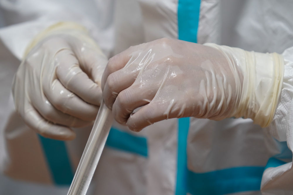 ↑7月24日晚,汪雨在南京市江宁区龙西社区核酸检测点准备为社区居民进行核酸检测取样,她的手套里面全是汗水。