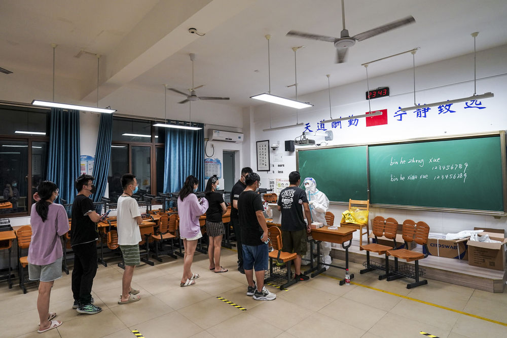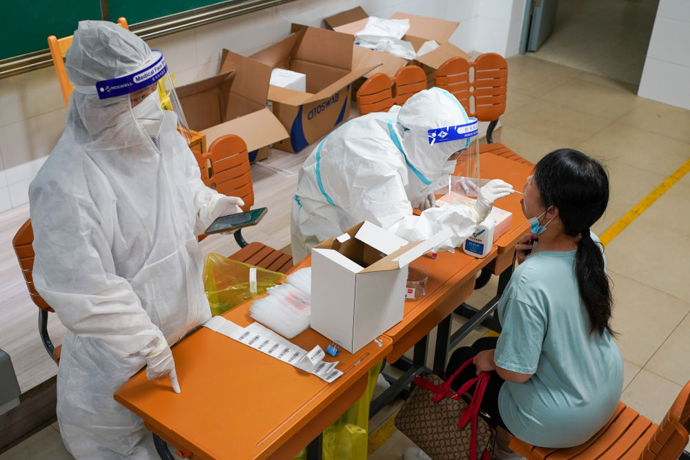 ↑7月25日凌晨,汪雨(中)在南京市江宁区龙西社区核酸检测点为社区居民进行核酸检测取样。