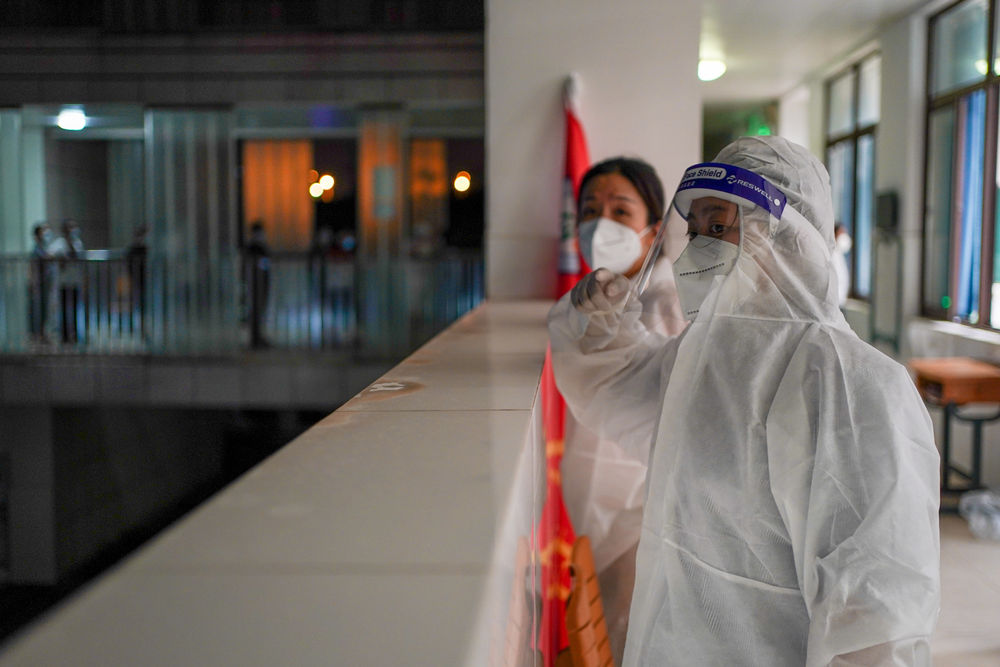 ↑7月25日凌晨,在南京市江宁区龙西社区核酸检测点,龙西社区的工作人员余娟(右)在查看前来检测核酸的居民人数。