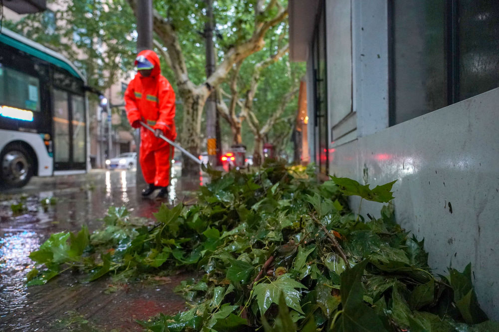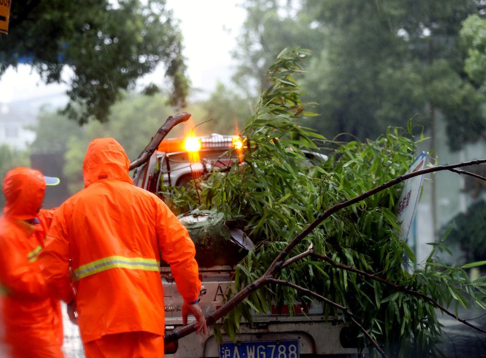 ↑7月25日,环卫人员在上海市闵行区的道路上清理断枝。