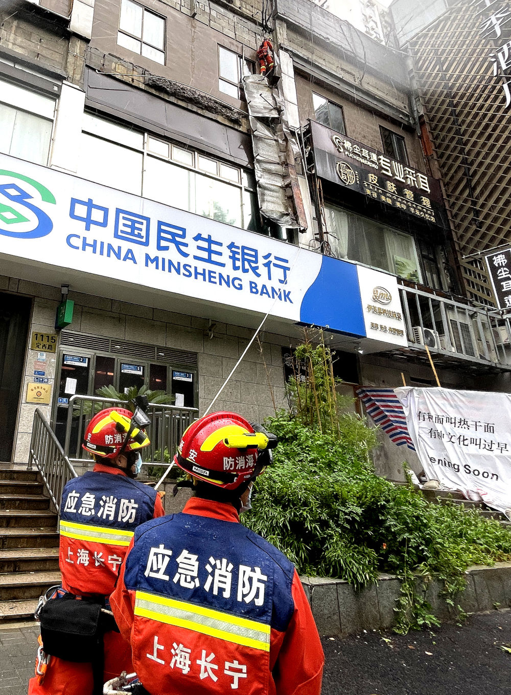 ↑7月25日,消防员在上海定西路上将被强风吹松动的广告牌清除。