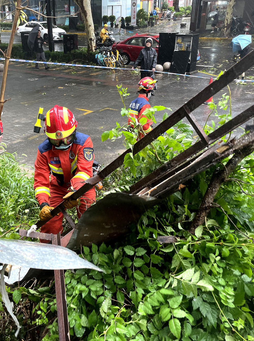 ↑7月25日,消防员在上海定西路上将被强风刮倒的树木锯断后清除。