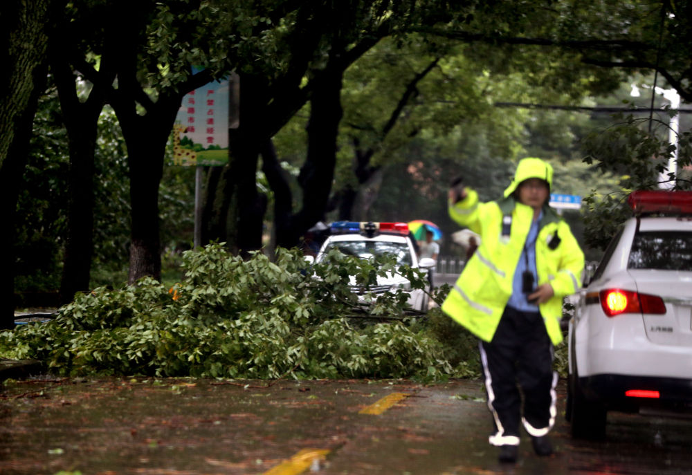 ↑7月25日,在上海市闵行区的道路上,折断的树枝阻挡道路,警察在现场指挥车辆绕行。