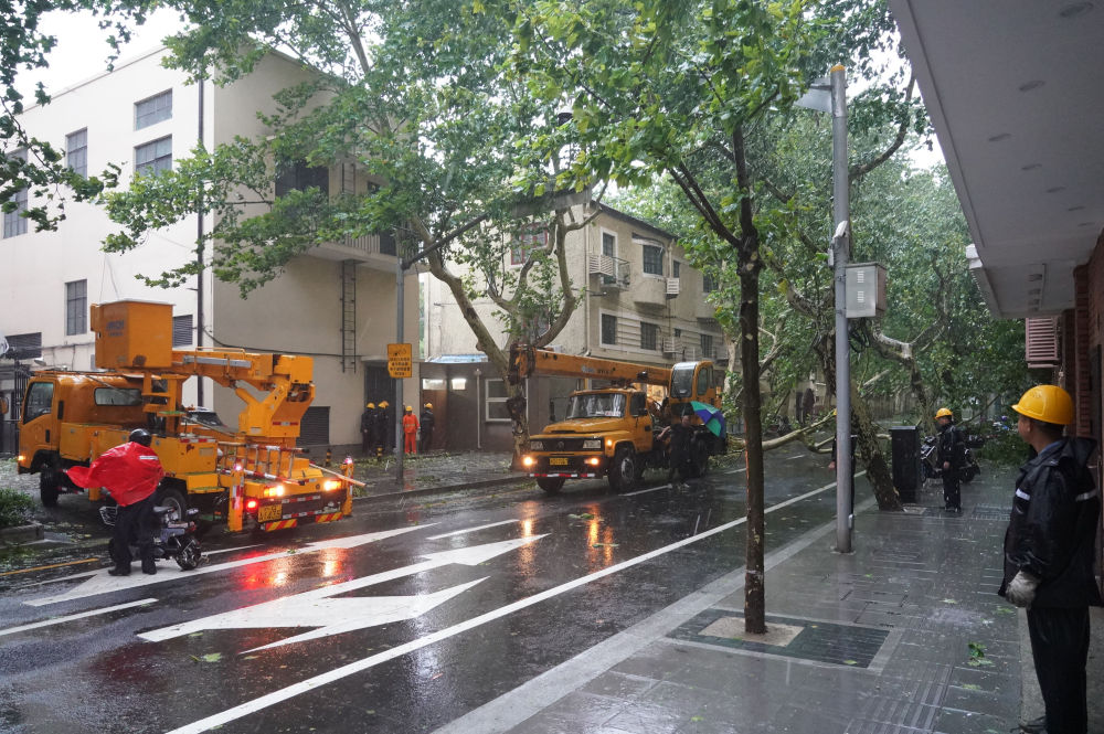 ↑7月25日,工作人员在上海高安路清理被刮倒的树木。