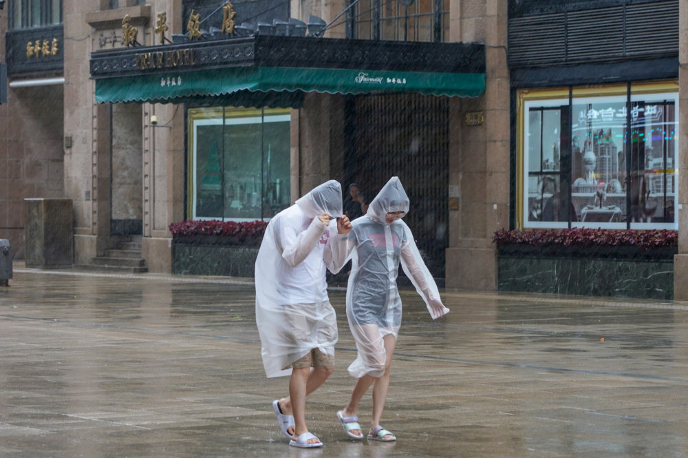 ↑7月25日,人们在上海南京路步行街上冒着风雨前行。