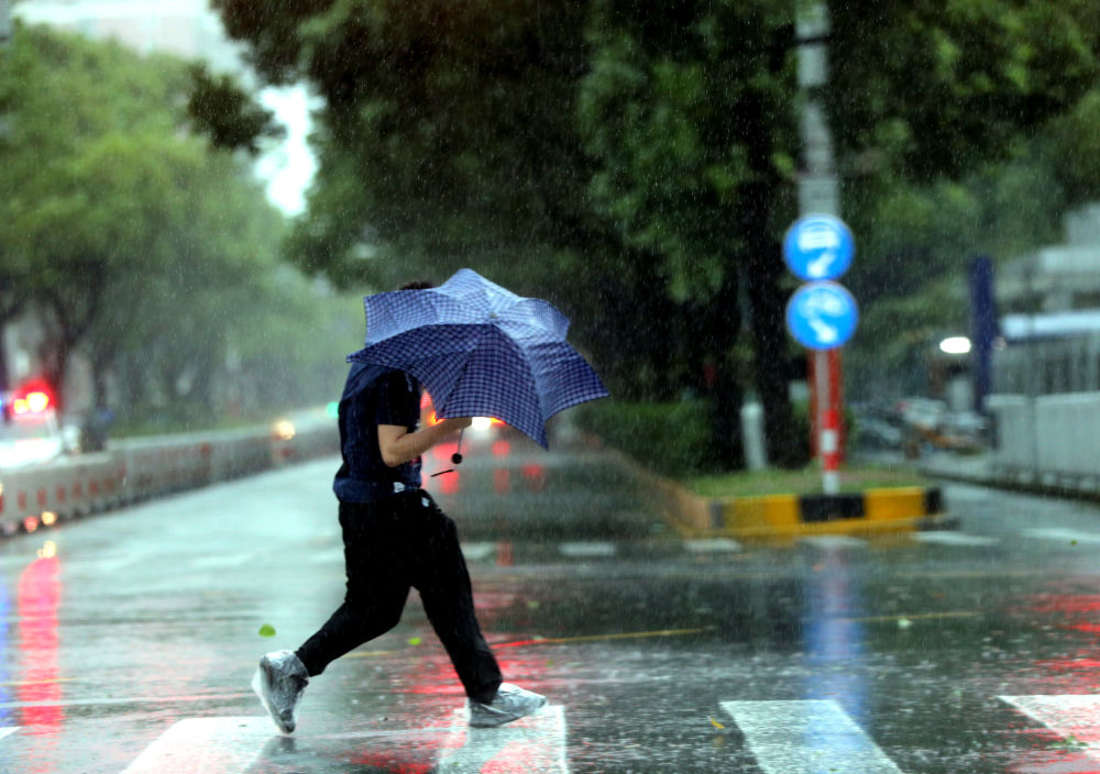 ↑7月25日,行人在风雨中走过上海市闵行区一处斑马线。