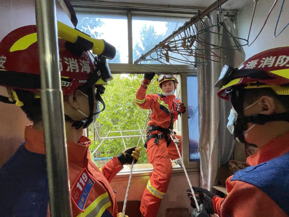 ↑7月25日,消防员在一户居民家中拆除被强风吹松动的窗户围栏。