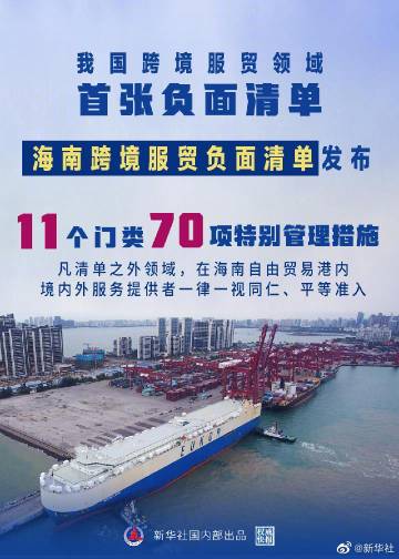【#权威快报#|#海南跨境服贸负面清单发布#】商务部网站7月26日公布海南跨境服贸负面清单,这是我国跨境服务贸易领域首张负面清单,列出针对境外服务提供者的11个门类70项特别管理措施,凡清单之外领域,在海南自由贸易港内,境内外服务提供者一律一视同仁、平等准入,开放度、透明度和可预见性都更高。清单在专业服务、交通运输、金融等领域作出水平较高的开放安排,是又一次制度型开放的体现。(记者于佳欣,海报设计贾伊宁)