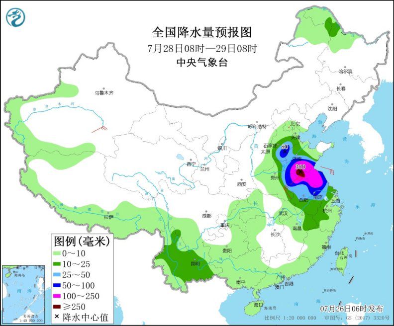 7月28日8时至29日8时,华北东南部、黄淮中部、江淮中东部等地部分地区有大雨或暴雨,其中,山东南部、江苏中北部、安徽北部、河南东部等地部分地区有大暴雨,局地特大暴雨。安徽北部、江苏北部、山东南部、河南东部等地部分地区有6~7级风,阵风8~9级。