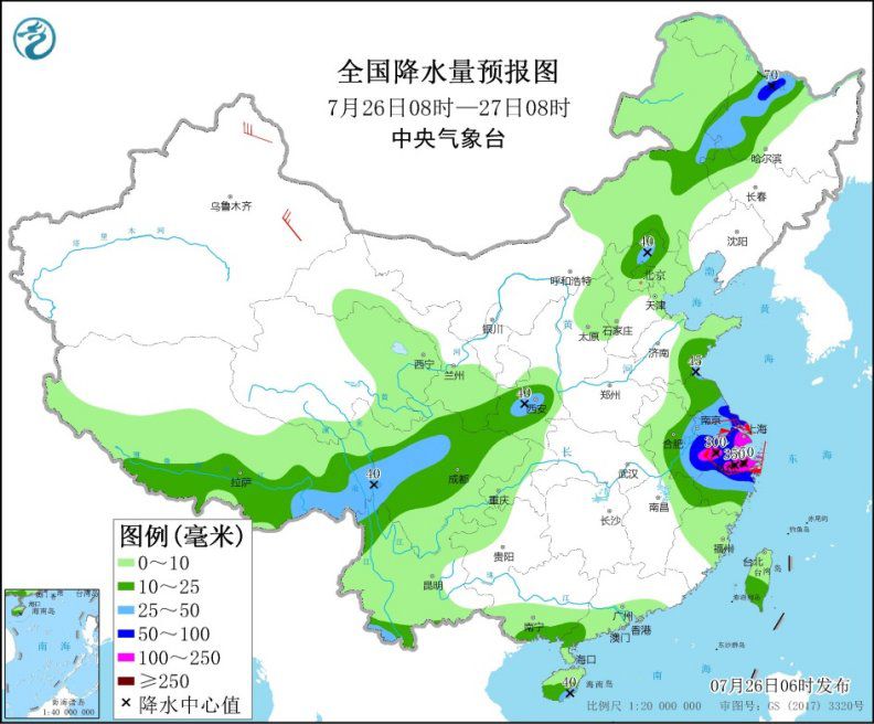 7月26日8时至27日8时,浙江中北部、上海、江苏中南部和东部、安徽东南部、内蒙古东部、黑龙江西部、云南南部、海南岛南部、西藏东南部、川西高原以及陕西南部等地的部分地区有大雨或暴雨,其中,浙江北部、上海、江苏东南部、安徽东南部等地的部分地区有大暴雨,浙江北部等地的局地有特大暴雨。华东沿海等地部分地区有6~7级风,阵风8~9级,台风中心附近风力可达10~12级,阵风12~14级。