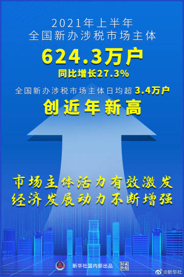 【#权威快报#|#上半年全国新办涉税市场主体日均超3.4万户创近年新高#】国家税务总局26日发布数据显示,今年上半年,全国新办涉税市场主体624.3万户,同比增长27.3%;全国新办涉税市场主体日均超3.4万户,创近年新高。企业销售收入同比增长34.4%,两年平均增长15.1%。国家税务总局收入规划核算司副司长赵连伟表示,税收情况反映出随着“放管服”改革逐步深化,我国市场主体活力得到有效激发,经济发展动力不断增强。(记者邹多为、王雨萧;海报设计杨轶群)