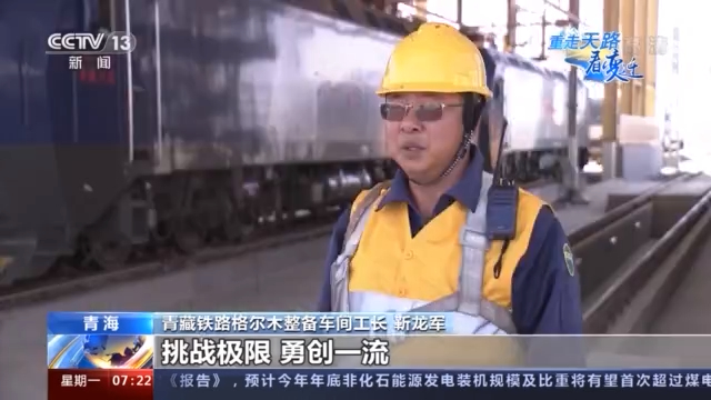 青藏铁路格尔木整备车间工长 靳龙军:速度也在大幅提高,机车的科技含量也在增加。需要我们多学习多努力。青藏铁路精神“挑战极限、勇创一流”,每个人都能干好自己的这一摊,我们的铁路工作就能安全、有序、平稳的发展。