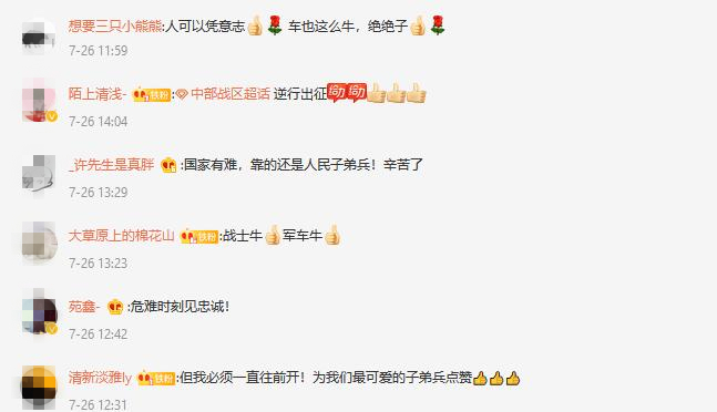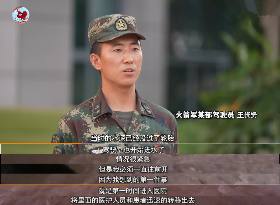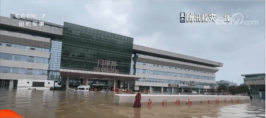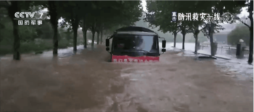 视频中,洪水漫至车窗,军车仍然坚定前行,车身上的横幅上写着“危难时刻见忠诚”,这辆军车正是第一辆到达郑州阜外华中心血管病医院的救援车辆。