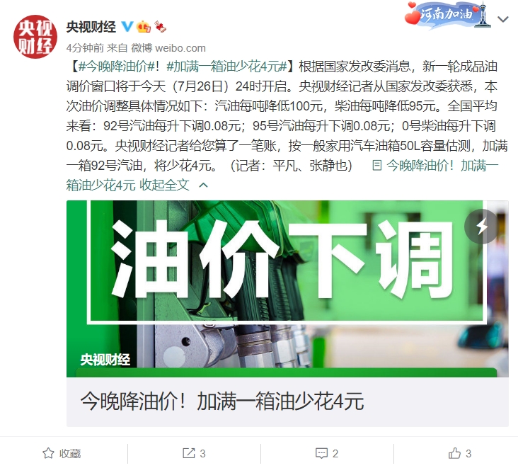 【今晚降油价!加满一箱油少花4元】根据国家发改委消息,新一轮成品油调价窗口将于今天(7月26日)24时开启。央视财经记者从国家发改委获悉,本次油价调整具体情况如下:汽油每吨降低100元,柴油每吨降低95元。全国平均来看:92号汽油每升下调0.08元;95号汽油每升下调0.08元;0号柴油每升下调0.08元。央视财经记者给您算了一笔账,按一般家用汽车油箱50L容量估测,加满一箱92号汽油,将少花4元。(记者:平凡、张静也)
