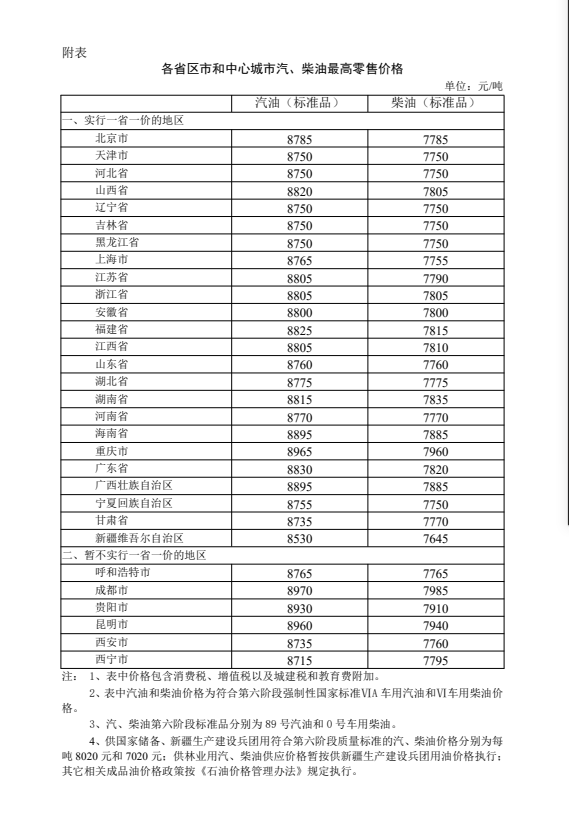 附:各省区市和中心城市汽、柴油最高零售价格