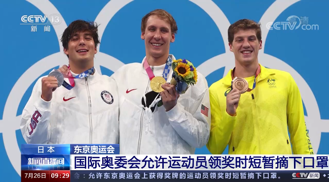 据了解,东京奥运会开赛以来,不少获奖运动员都对“口罩令”不满,国际奥委会因此于25日依据公共卫生专家的建议作出修改,从当天起允许获得奖牌的运动员“站在各自领奖台上时摘下口罩至多30秒,供媒体记者拍照”。