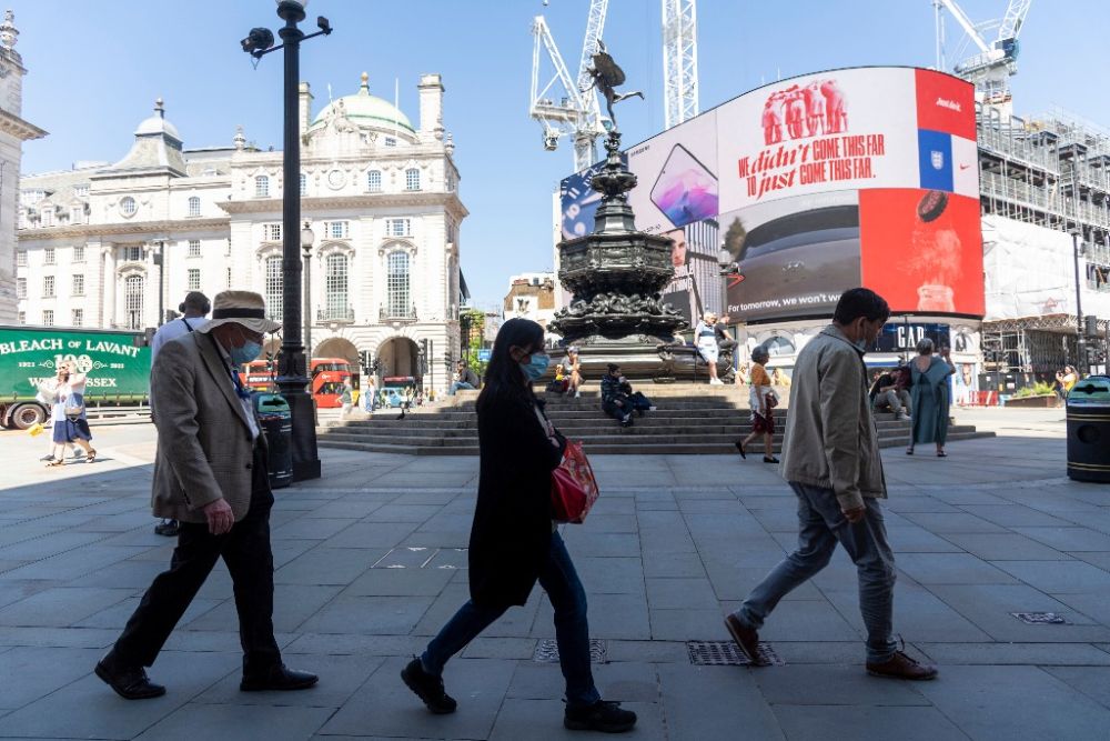 7月16日,人们戴着口罩走在英国伦敦街头。(新华社发 雷伊·唐摄)