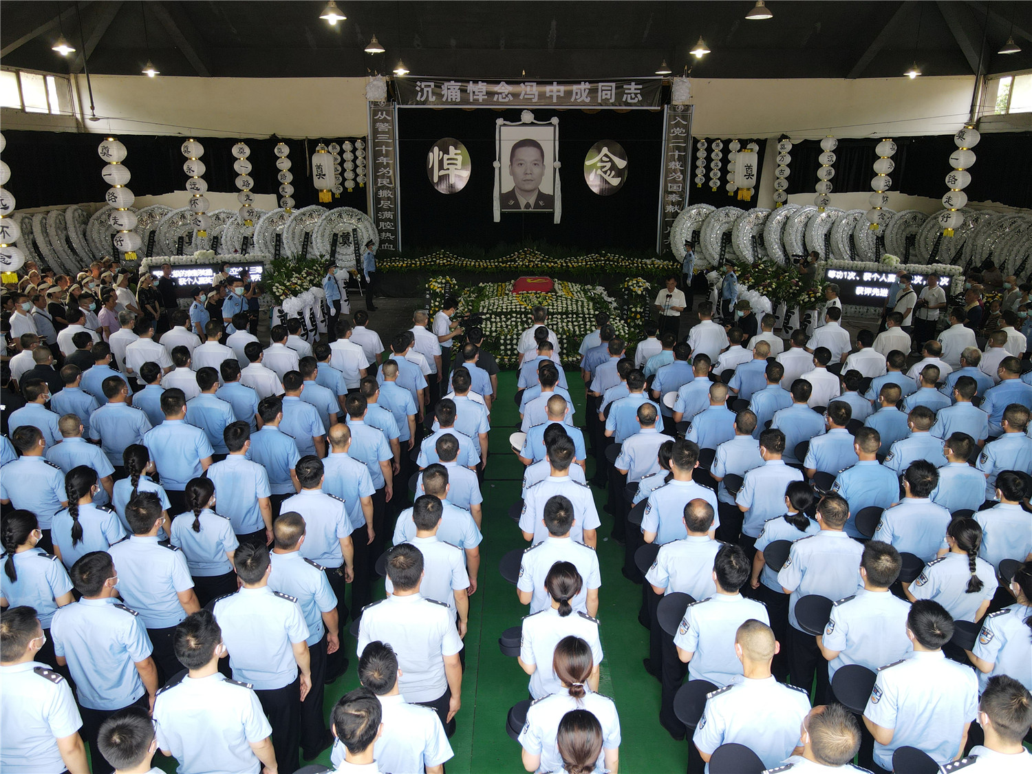 7月21日,重庆市石柱土家族自治县公安局交巡警大队车管所民警冯中成为保护群众生命安全,与持刀行凶歹徒英勇搏斗,不幸被刺伤肝脏,经抢救无效壮烈牺牲,年仅53岁。7月23日下午3时,冯中成遗体告别仪式在石柱县殡仪馆举行,冯中成生前领导、战友和各界群众共600余人自发前往悼念送行。(总台记者 牟亮)
