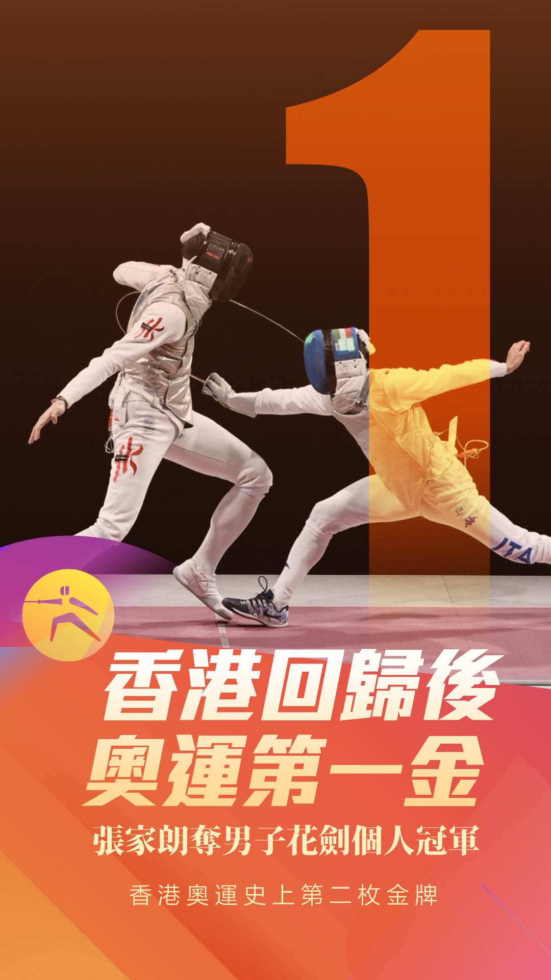 7月26日,在东京奥运会击剑项目男子个人花剑决赛中,中国香港选手张家朗战胜意大利选手加罗佐,夺得冠军。这是香港回归祖国后的奥运首金,也是香港奥运史上第二枚金牌。