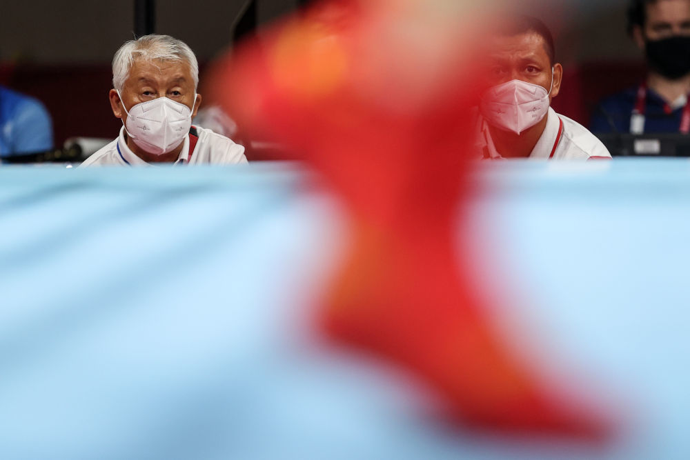 7月25日,中国拳击队领队张传良(左)与教练哈达巴特尔在现场观战。新华社记者 欧东衢 摄