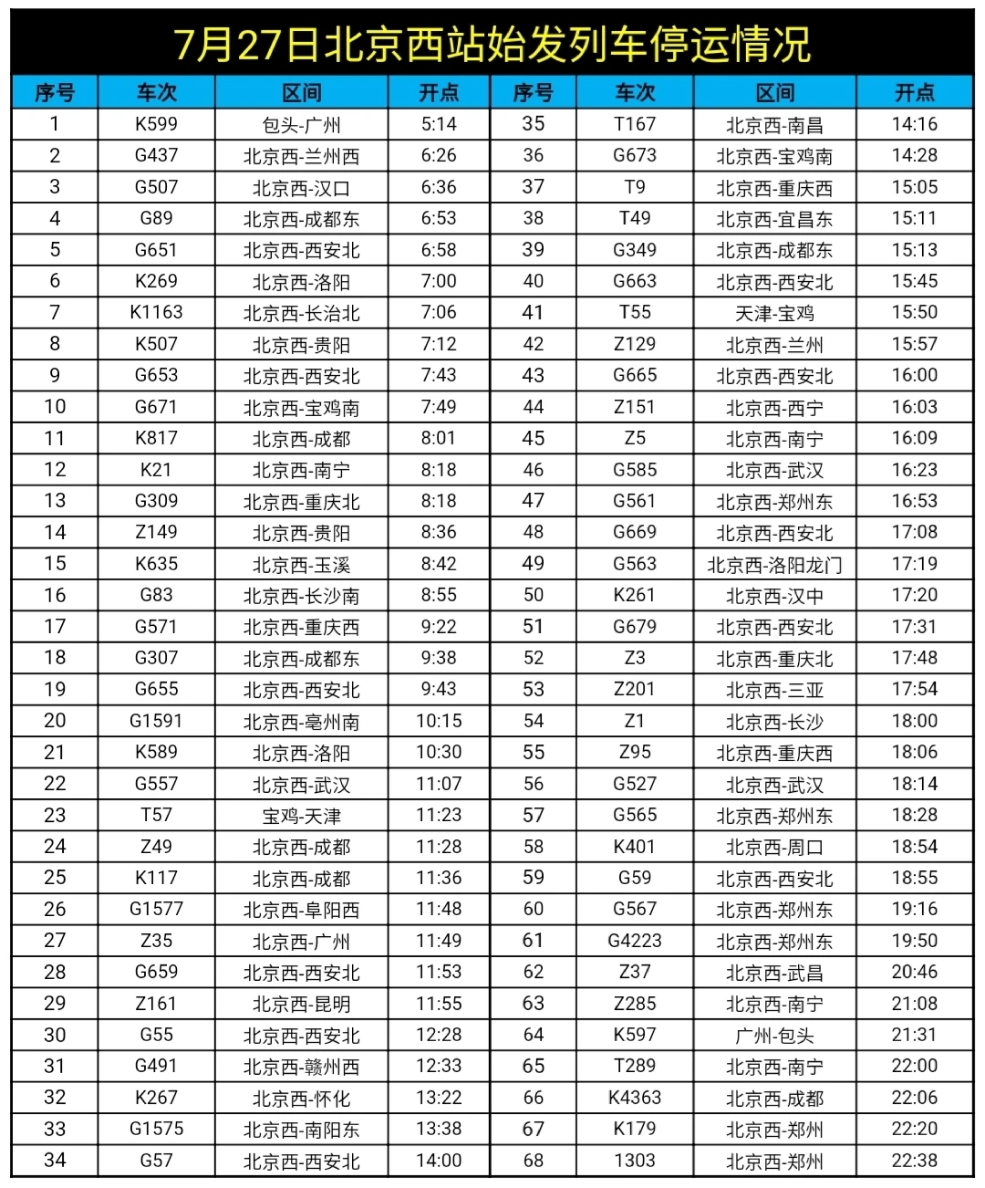 受河南多地遭遇持续强降雨天气影响,7月27日北京西站部分始发列车停运。已购相关列车车票的旅客,可于30日内办理全额退票手续。