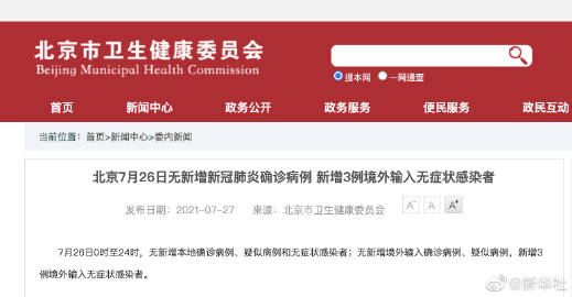 【#北京26日无新增新冠肺炎确诊病例# #北京26日新增3例境外输入无症状感染者#】据北京市卫生健康委员会,7月26日0时至24时,无新增本地确诊病例、疑似病例和无症状感染者;无新增境外输入确诊病例、疑似病例,新增3例境外输入无症状感染者。