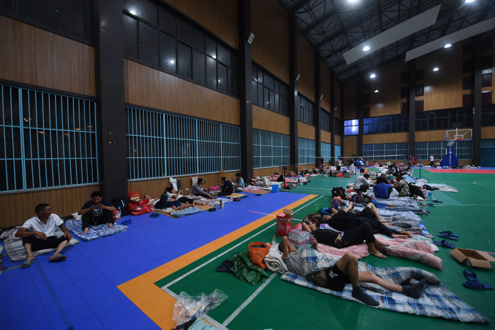 7月25日晚,在浙江嘉兴平湖市乍浦高级中学避灾点,从周边工地转移到这里的工人在休息。新华社记者 徐昱 摄