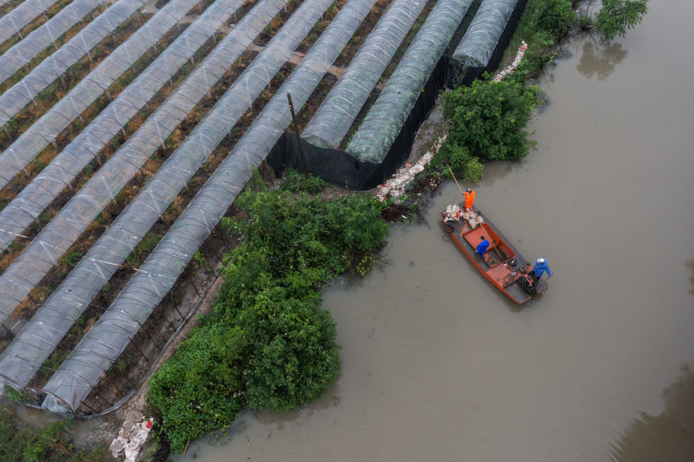7月26日,在嘉兴市南湖区大桥镇江南村,抢险人员在用船运送沙袋封堵河堤,防止河水漫入大棚(无人机照片)。新华社记者 徐昱 摄